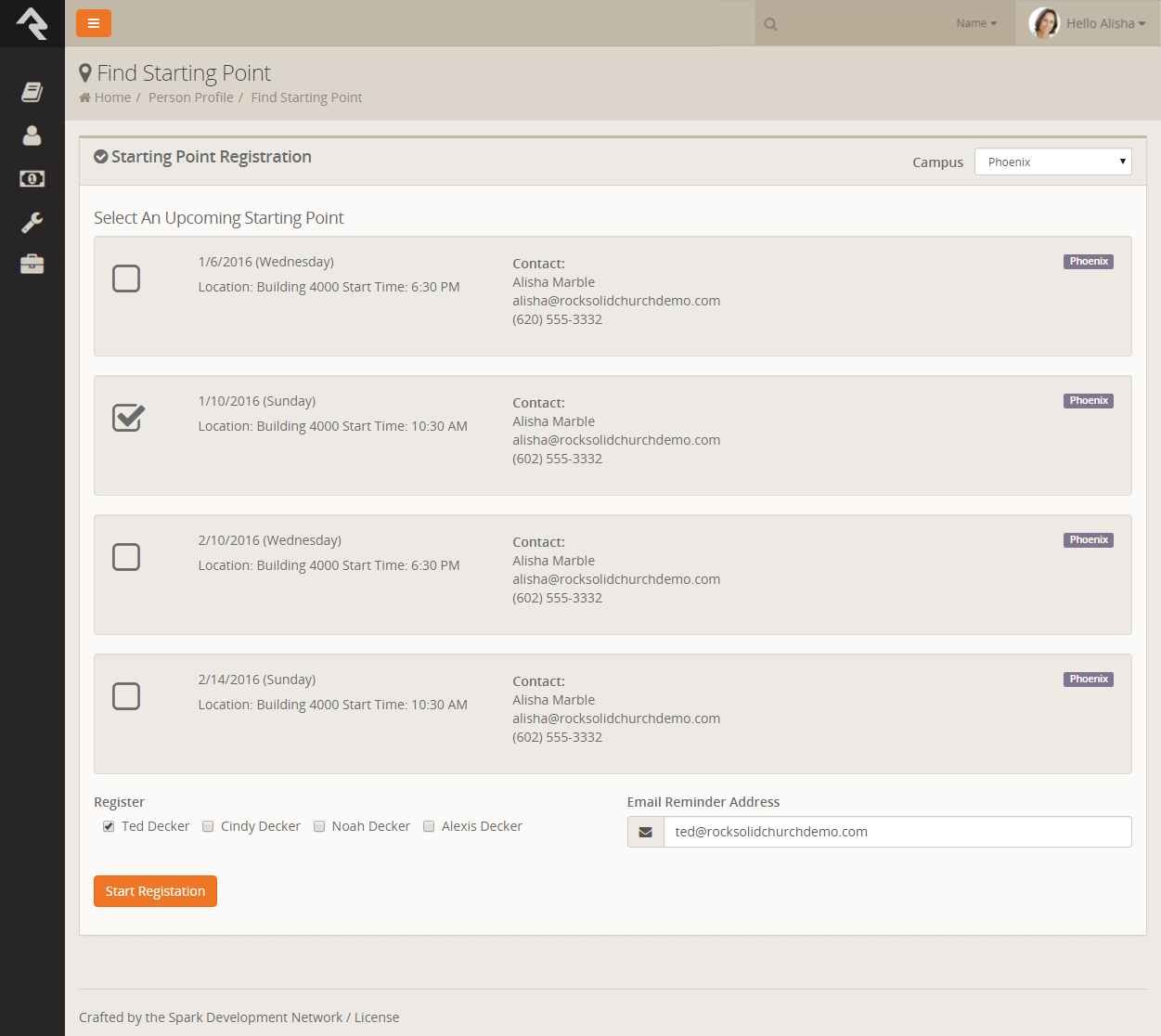 they have not attended Starting Point. This block takes the person and looks up upcoming class dates based on their campus. Once you