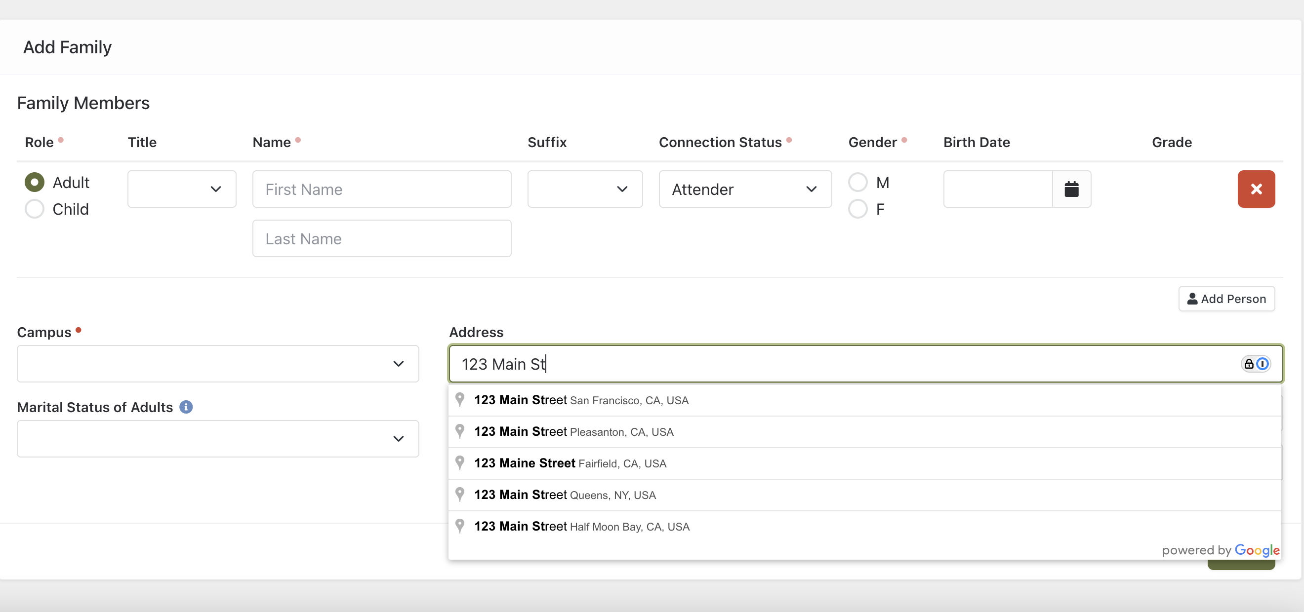 3 Autocomplete Address When Adding New Family Shared by Alex Yarmolatii, The Promise Center 5 months ago 17.0 Administration / Finance, CRM, General, Operations, Web, Workflow Intermediate To provide predictive address autocomplete (street suggestions as you type), you’ll need to: - Add a custom JavaScript solution to the page (Pages → Page → Advanced → Page HTML or add script to the theme) that calls a geocoding API (Google Places, Mapbox, etc.). - You need to have the Google API key in Global Attributes. The key in the script uses Rock’s Global Attribute: {{ 'Global' | Attribute:'GoogleAPIKey' }} so you don’t have to hardcode your API key.Step 1 - Add Your Script to the PageGo to your Add Family page (or whichever one you want autocomplete on)One of the ways is to go to CMS → Pages → Internal Homepage → Manage → New FamilyAdd HTMP block and paste this script:<script src="https://maps.googleapis.com/maps/api/js?key={{ 'Global' | Attribute:'GoogleAPIKey' }}&libraries=places"></script><script>document.addEventListener("DOMContentLoaded", function() { // Wait for the address field to load var addressInput = document.querySelector("input[id$='_tbStreet1']"); if (addressInput) { var autocomplete = new google.maps.places.Autocomplete(addressInput, { types: ['address'], componentRestrictions: { country: 'us' } }); autocomplete.addListener('place_changed', function() { var place = autocomplete.getPlace(); // Try to populate City, State, Zip if found if (place.address_components) { let cityField = document.querySelector("input[id$='_tbCity']"); let stateField = document.querySelector("input[id$='_ddlState']"); let zipField = document.querySelector("input[id$='_tbPostalCode']"); place.address_components.forEach(component => { const type = component.types[0]; if (type === "locality" && cityField) cityField.value = component.long_name; if (type === "administrative_area_level_1" && stateField) stateField.value = component.short_name; if (type === "postal_code" && zipField) zipField.value = component.long_name; }); } }); }});</script>Save and test it.Go to your Add Family pageStart typing 123 Main StGoogle should start showing address suggestions Download File