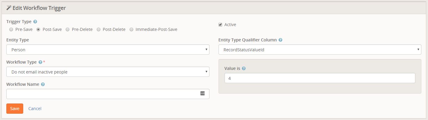 Note that the value of `4` that I used here was based on the DefinedTypeValue of `Inactive` - you can verify that in General Settings -> Defined Types, but it *should* be correct. This will cause the workflow to run every time a person record is saved and their record is inactive. But running it multiple times won't hurt anything, it'll just set their email to inactive again ;-) If you want to include more statuses, you'll need to create additional triggers, I believe.