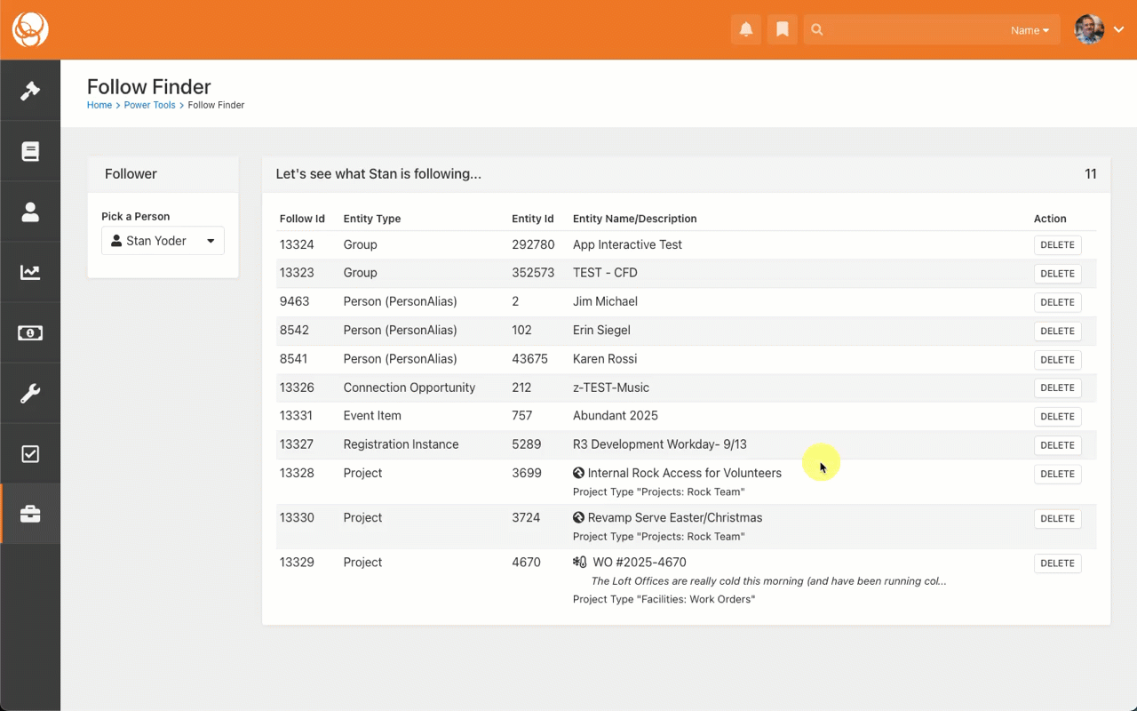1 Manage Following records with Helix (a.k.a. Lava Applications) Shared by Stan Yoder, The Crossing - Chesterfield 2 months ago 16.6 General Advanced Overview The Following feature in Rock is a powerful tool for users to track people, groups, events, and more. However, when a staff member with multiple Following records leaves and loses access to restricted items, they may receive unwanted email notifications to their personal email. Manually resolving this issue is challenging. Impersonating the user to unfollow entities isn't possible due to their profile now having restricted access. Directly deleting records via SQL risks removing legitimate Following records, such as those for content channel item or prayer, which the user may still be authorized to manage. This recipe creates a utility that offers Rock Admins a safe and streamlined solution to manage these records effectively, ensuring precise updates without unintended deletions. Tip This recipe includes references to Projects and Tasks entities from the Project Management plug-in by Blue Box Moon. Be sure to remove or comment these references out if you do not use this plug-in. Assumptions/prerequisites This recipe assumes that you know the basics of creating a webpage, adding blocks to a page, and have the Helix plug-in installed and know how to access its settings. Components Lava Application Webpage Page Parameter Filter block Lava Application Content block HTML Content blocks for styling & scripts Lava Application Add a new Lava Application to your instance NAME: Rock Admin Utilities DESCRIPTION: be kind to your future self and give it a description SLUG: admin-utilities CONFIGURATION RIGGING: use the following code { "EntityTypeIds" : { "Group" : 16, "PersonAlias" : 226, "ConnectionOpportunity" : 297, "EventItem" : 321, "RegistrationInstance" : 337, "Project" : 933, "ProjectTask" : 934, "Prayer" : 33, "ContentChannelItem" : 208 } } Important Be sure to update these EntityTypeIds to the ones for your Rock instance. Add a new Endpoint to your Lava Application NAME: Follow Finder - Delete DESCRIPTION: be kind to your future self and give it a description SLUG: follow-finder-delete HTTP METHOD: Put SECURITY MODE: Endpoint Execute CODE TEMPLATE: use the content from Endpoint.lava in the attached zipfile ENABLED LAVA COMMANDS: Rock Entity & Rock Entity Delete Important After the Endpoint is created - be sure to add your Rock Admin security role to "Execute" permission for the endpoint. Web Page Create a new page for the utility (we put ours under the Power Tools page) Add the following blocks to this page HTML Content - for page styling Page Parameter Filter - for picking the person Lava Application Content - where the magic happens HTML Content - for scripts HTML Content - Styles NAME: Styles CONTENT: use the following code <style> .panel.panel-follow-finder .panel-heading .panel-title i { display: unset; } tr.htmx-swapping td { opacity: 0; transition: opacity 1s ease-out; } .toast-notification { background: white; color: black; border-radius: 0 5px 5px 0; box-shadow: rgba(0, 0, 0, 0.1) 1.95px 1.95px 2.6px; position: fixed; bottom: 30px; right: 20px; padding: 10px 20px; z-index: 10000; opacity: 1; transition: opacity 0.5s; display: flex; align-items: center; } .toast-notification.success { border-left: 4px solid #2e844a; /* Success green */ } .toast-notification.error { border-left: 4px solid #C12700; /* Error red */ } .toast-icon { margin-right: 10px; } .toast-icon.success { color: #2e844a; /* Match success border color */ } .toast-icon.error { color: #C12700; /* Match error border color */ } </style> Page Parameter Filter BLOCK TITLE TEXT: Follower Turn off Show Filter Button Turn off Show Reset Filters Button Set Selection Action to Update Page Add 1 filter NAME: Pick a Person KEY: Person FIELD TYPE: Person Lava Application Content NAME: Follow Details APPLICATION: Rock Admin Utilities LAVA TEMPLATE: use the content from LavaAppContent.lava in the attached zipfile ENABLED LAVA COMMANDS: Rock Entity HTML Content - Scripts NAME: Scripts CONTENT: use the following code <script> var toastTimeout; // Function to display a toast notification function showToast(message, type) { var toast = document.createElement('div'); toast.className = 'toast-notification ' + type; // Create the icon element var icon = document.createElement('i'); icon.className = (type === 'success' ? 'far fa-check-circle' : 'far fa-exclamation-circle') + ' toast-icon ' + type; // Create the text node var text = document.createElement('span'); text.innerText = message; // Append icon and text to the toast toast.appendChild(icon); toast.appendChild(text); // Append the toast to the body document.body.appendChild(toast); // Remove toast after 5 seconds setTimeout(function() { toast.style.opacity = 0; setTimeout(function() { document.body.removeChild(toast); }, 500); }, 5000); } // Function to debounce showing the toast notification function debounceToast(message, type) { clearTimeout(toastTimeout); toastTimeout = setTimeout(function() { showToast(message, type); }, 50); // Show toast after inactivity } </script> The Result Download File